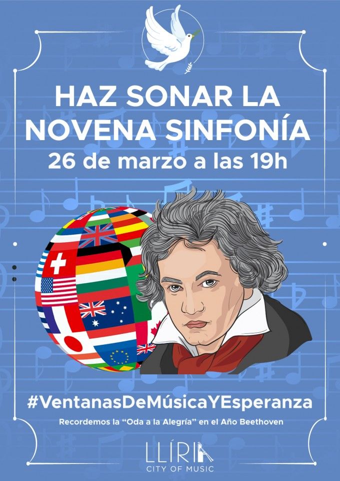 El pasado jueves 26 de marzo, a las 19 horas, Llíria, Ciudad Creativa de la Música de la UNESCO, hizo sonar en los balcones de la localidad y de muchos otros lugares la «Oda a la Alegría» de Beethoven por el 197 aniversario de su fallecimiento y en el marco del «año Beethoven», 250 años después de su nacimiento. La iniciativa #VentanasDeMúsicaYEsperanza se difundió por las redes sociales y, junto con la etiqueta #LlíriaCityOfMusic, logró transmitir un mensaje de unión y esperanza y rendir homenaje al compositor en medio de la crisis sanitaria por el coronavirus.