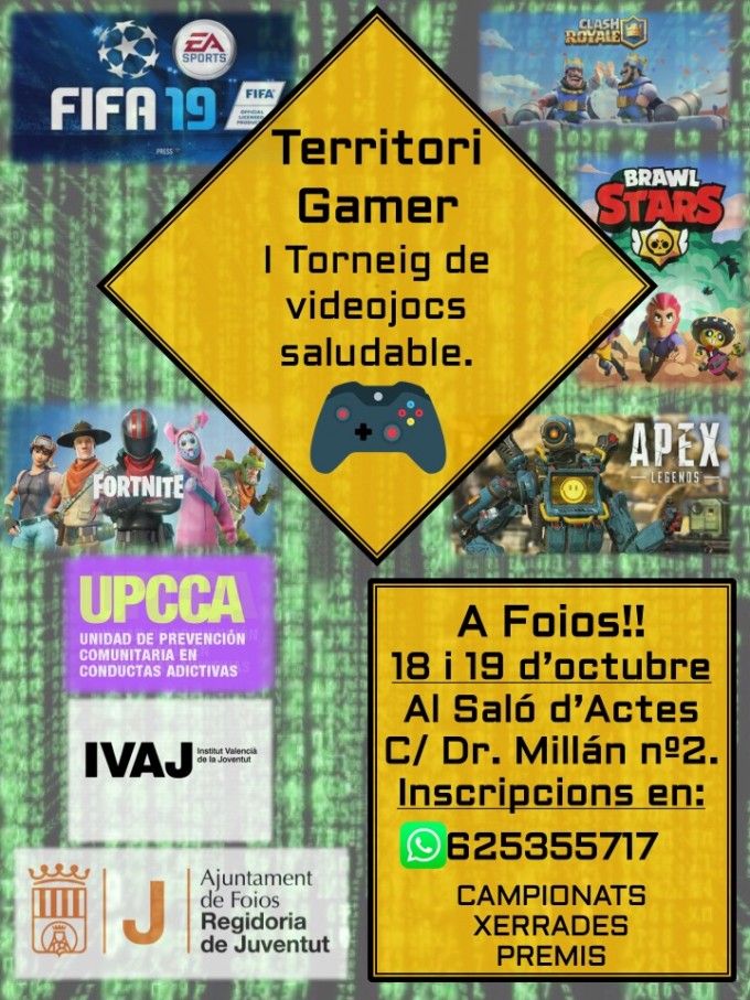 El món dels videojocs se cita a Foios per al 1r Torneig de Videojocs Saludables "Territori Gamer", un cap de setmana dedicat a jugar d'una forma responsable, compaginant el temps dedicat a les partides amb activitats físiques a l'aire lliure i tallers d'ajuda i addicció. Tindrà lloc el divendres 18 i dissabte 19 d'octubre al saló d'actes de l'Ajuntament i es competirà en els jocs Fifa, Fortnite, Brawl Stars, Clash Royale i Apex Legends, junt amb les xerrades de prevenció d'addiccions a videojocs i gestió d'estudi-oci.