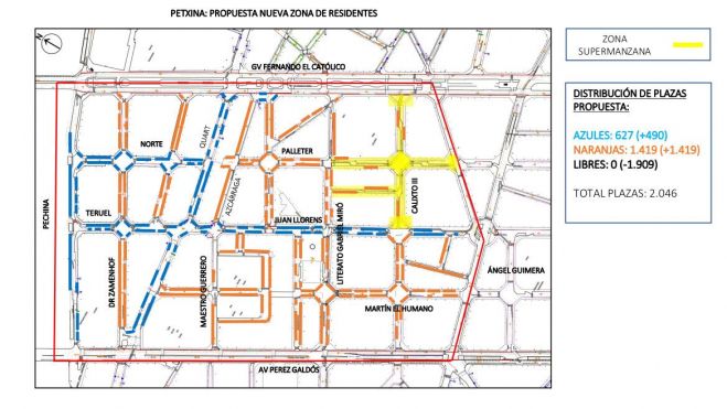 Encara que en una primera proposta es plantejaven 654 places en Zona Blava i 1.392 de taronja, l'Ajuntament de València explica, en un comunicat de premsa, que "després de la reunió amb l'Associació de Veïns es va decidir incrementar la zona taronja en alguns dels carrers més residencials, per la qual cosa la distribució final comptarà amb 1.419 places en Zona Taronja i 627 places en Zona Blava".