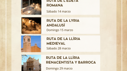 Així, la localitat edetana continua amb la seua promoció turística oferint una nova tanda de rutes guiades tematitzades. L'àrea de Turisme ha preparat els itineraris turísticoculturals de l’Edeta Romana i de la Lyria Andalusina per al cap de setmana del 14 i 15 de març; mentres que es podrà gaudir de la Llíria Medieval i de la Llíria del Renaixement i del Barroc els dies 28 i 29 de març, respectivament.