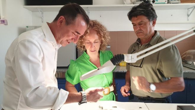 L'alcalde de Riba-roja, Robert Raga, junt amb professionals arqueòlegs examinant les peces recuperades de València la Vella