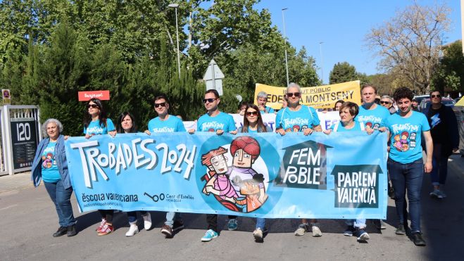 Amb el lema 'Fem poble. Parlem Valencià', milers de persones han respost a la crida de les Trobades acudint a Burjassot, procedents de nombroses poblacions de la comarca. El matí festiu i reivindicatiu per un ús del valencià en l'àmbit escolar, ferm, compromés i sense restriccions, va començar amb dues cercaviles que van desembocar al mateix temps en la plaça de l'Ajuntament. Obria la multitudinària comitiva que va començar el seu itinerari des de l'IES Vicent Andrés Estellés una gran pancarta de les Trobades que portava l'alcalde de Burjassot, Rafa García; la regidora de Promoció del Valencià, Estefanía Ballesteros; Pablo Montaner i Brotons, vicepresident d'Escola Valenciana i diferents regidors i regidores de la corporació municipal.