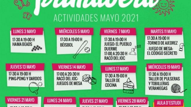 La Casa de la Joventut de Paterna ha programat per a aquest mes de maig tota una sèrie d'activitats, subjectes als protocols anticovid, i dirigides als joves de la ciutat d'entre 12 i 30 anys.
