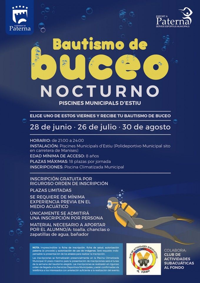 Els Serveis Esportius Municipals de l'Ajuntament de Paterna han organitzat classes de baptisme de busseig en el complex de Piscines d'Estiu de la carretera Manises.