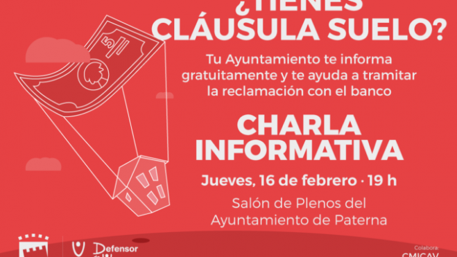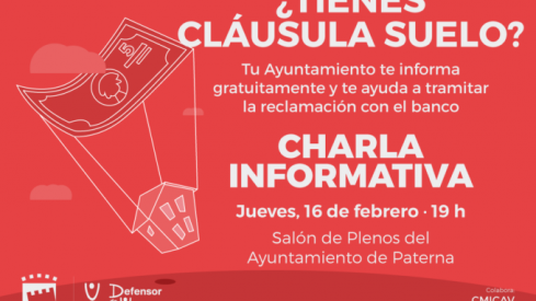L'Ajuntament de Paterna, a través de l'Oficina del Defensor del Veí, celebrarà hui, 16 de febrer una xarrada informativa dirigida a tots els veïns i veïnes afectats per les clàusules sòl.