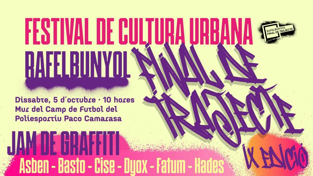 La novena edició del festival de cultura urbana Rafelbunyol Final de Trajecte mostrarà enguany les peces de Bast, Cise i Dyox, tres exemples distints de l'evolució dels wraiters des de l'estil més clàssic dels 80 fins a l'abstracció de hui dia.
