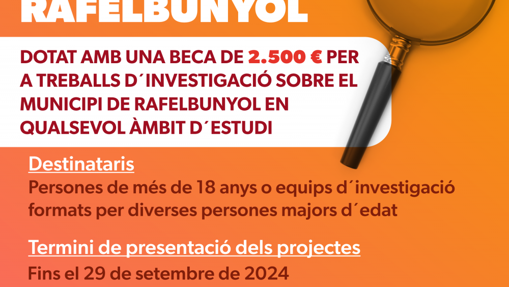 Les persones o equips que desenvolupen un projecte d'investigació sobre Rafelbunyol, ja siga en l'àmbit social, cultural, històric, ambiental, econòmic, o qualsevol altre, podran optar a esta beca, dotada amb 2.500 euros, per a dur a terme la seua proposta.