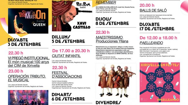 El programa d'actes tindrà el seu punt àlgid en les festes majors, que aniran del 2 al 24 de setembre. Hi haurà música per a tots els públics i gustos com l'actuació de l'orquestra La Tribu, el tribut a Queen i el musical Operación Tributo, també humor amb Maestríssimo i amb Xavi Castillo, hi haurà un espectacle itinerant amb focs, cordaes, activitats per als joves en el Barracó Jove i també per als més xicotets com la V Marxa de colors o el concert de la Billy Boom Band, a més d'inflables, tallers i la fira. Tots els espectacles seran gratuïts i arribaran a tots els barris de la localitat, des de Sant Ramon al barri de la Llum, passant per avinguda de la Pau, zona centre o Vicentica la Serrana.