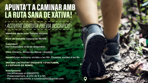 L’Ajuntament de Xàtiva reprèn a partir del mes d’octubre l’activitat de la Ruta Sana amb la qual es dóna als veïns i veïnes de Xàtiva l’oportunitat de fer exercici i millorar la seua forma física amb l’ajuda d’un monitor de forma totalment gratuïta.