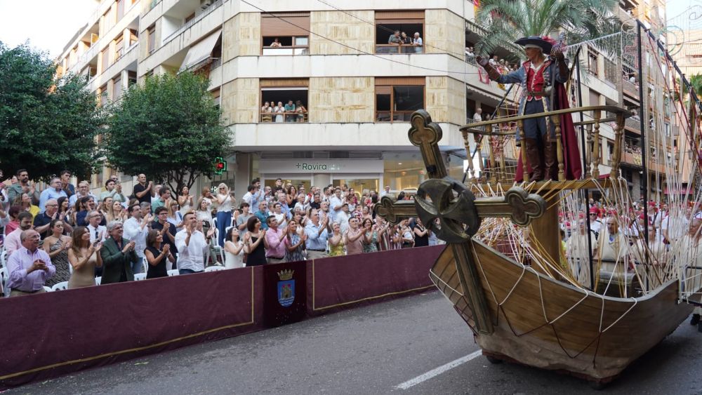 L’Entrada Mora arrancava amb la capitania dels Moros Berberiscos, que este any s’inspirava en Barbaria i en la conxa de cauri, utilitzada com a moneda en temps ancestrals. El capità, Sisco Beneyto, en el paper d’Hizzir Bin Yakubm, apareixia acompanyat per la seua mà dreta, Sayyida al Hurra, i escortes amb maquillatges de gran espectacularitat. Des de torres de vigilància fins a escenes de batalla amb guàrdies i guerreres, la desfilada combinava l’exotisme amb la força escènica de ballets com la “Dansa del mar i la tempesta” de Masters o “El poder del cauri” d’Ópera. Una cova daurada simbolitzava el tresor acumulat en les incursions, abans de l’entrada del capità i la seua favorita, envoltats d’escortes i soldats.