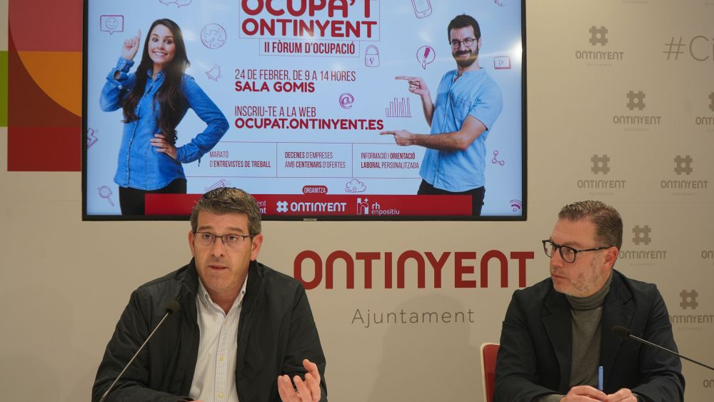 L'alcalde d'Ontinyent, Jorge Rodríguez, i el regidor de Promoció Econòmica, Pablo Úbeda, presentaven aquest dijous el II Fòrum d'Ocupació d'Ontinyent, que sota el nom "Ocupa't" Ontinyent tindrà lloc el pròxim 24 de febrer de 9:00 a 14:00 hores a la Sala Gomis, i que oferirà, per ara, més de 120 llocs de treball.