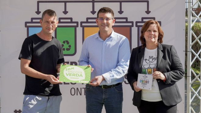 L'alcalde, Jorge Rodríguez, i el director del CEIP Bonavista d'Ontinyent, Kike Molina, junt a la regidora de Sostenibilitat, Sayo Gandia