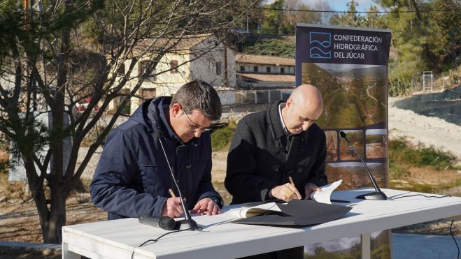 Jorge Rodríguez, alcalde d'Ontinyent, i Miguel Polo, president de la Confederación Hidrográfica del Júcar, signant l'acord.