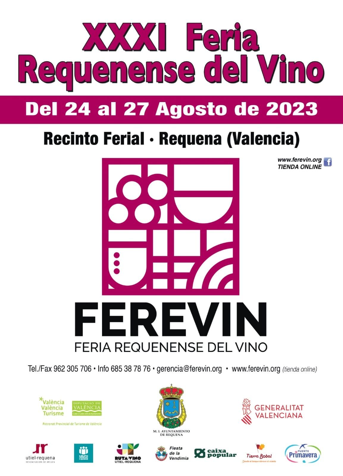 19.00 h: Obertura i inauguració de la XXXI edició de la Feria Requenense del vino 'Ferevín 2023', a càrrec d'autoritats, regnes presidents, comissions de la LXXIV Festa de la Verema, convidats i públic en general.