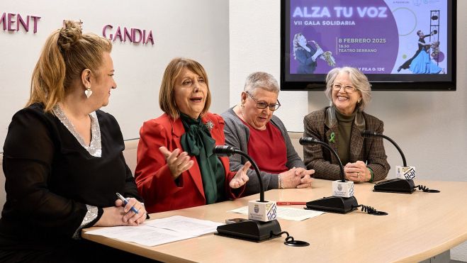 El pròxim 8 de febrer, el Teatre Serrano de Gandia acollirà la VII Gala Solidària ‘Alza tu voz’, que comptarà amb la participació de 14 cantants, 4 músics i 6 ballarins. Així l’ha indicat este matí la regidora delegada de Sanitat, Liduvina Gil, qui, junt amb la presidenta de l'Associació Espanyola Contra el Càncer a Gandia, Evelyne Cieslak; la presidenta de l'Associació del Parkinson de la ciutat, Mari Carmen Escrivà; i la soprano Montse Bermúdez ha presentat el certamen. La meta de l’esdeveniment és benèfic, ja que els diners recavats es destinaran a la lluita contra ambdues malalties.