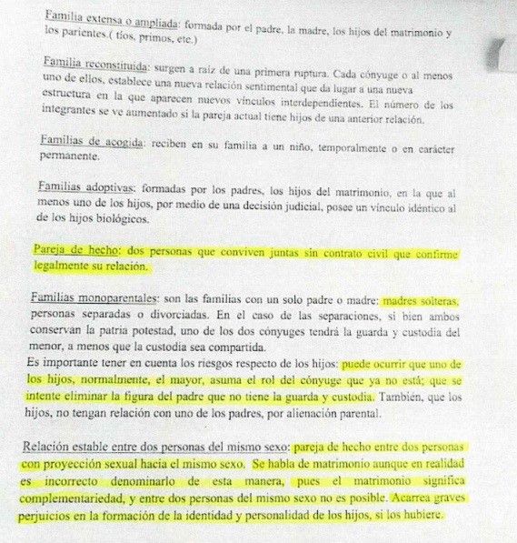 En els materials repartits entre els alumnes del grau d'FP s'estableix que la relació entre persones del mateix sexe "no pot ser denominada matrimoni" i "comporta greus perjuís en la formació i identitat dels fills".