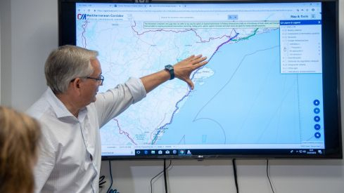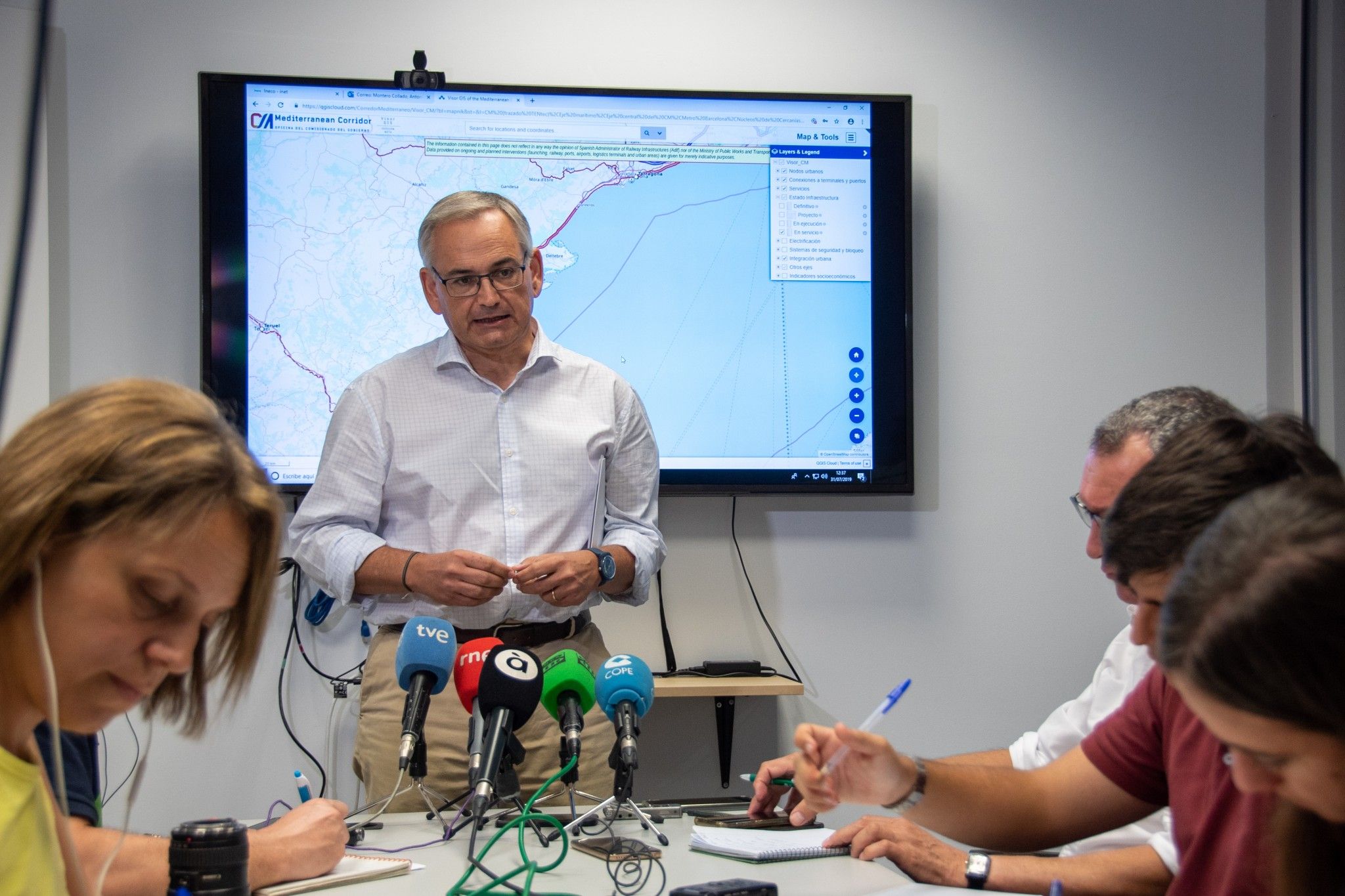 Amb un mapa explicatiu de fons, Boira ha assenyalat com "es canviarà de l'ample ibèric" a l'"ample internacional", en un tram que considera "fonamental" per al Corredor. Ara, detalla, s'està treballant en el Castellbisbal-Martorell i Martorell-Tarragona, amb un "tercer fil" amb ample internacional, i d'altra banda es treballa en "