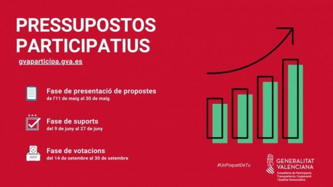 La Conselleria de Participació, Transparència, Cooperació i Qualitat Democràtica ha rebut 287 propostes als primers pressupostos participatius de la Generalitat per a 2022 des que es van obrir a la ciutadania el passat 11 de maig.Els ciutadans i ciutadanes poden presentar les seues propostes d'àmbit comarcal o autonòmic fins diumenge que ve 30 de maig, de forma únicament telemàtica a través del portal de la Generalitat GVA Participa.La consellera de Participació, Rosa Pérez Garijo, ha animat a la ciutadania a continuar participant i presentat les seues iniciatives "que permetrà que els valencians i valencianes formen part de les decisions d'aquest govern".Els primers pressupostos participatius de la Generalitat per a l'exercici 2022 compten amb 125 milions d'euros que es distribueixen atenent criteris de població, pobresa i despoblació. En aquest sentit, 87,5 milions d'euros, la qual cosa suposa el 70% dels recursos totals, es distribueixen en àrees comarcals de la Comunitat, mentre que els 37,5 milions restants, que representen el 30%, es dirigeixen a projectes d'àmbit autonòmic.De les 287 propostes rebudes, 123 es corresponen amb projectes d'àmbit autonòmic, mentre que 164 s'orienten a iniciatives d'abast comarcal. En aquest sentit, s'han rebut 40 propostes de les comarques Centrals; 34 de les comarques Costaneres del Nord; 38 de les Comarques de l'Horta; 7 de les comarques d'Interior; 7 de les comarques de l'Interior del Nord; 22 de les comarques del Sud; i 16 de les comarques del Xúquer-Túria.D'acord amb les categories que els ciutadans indiquen en les seues propostes, destaquen les relacionades amb l'ecologia, l'habitatge i l'educació.Poden participar totes les persones majors de 16 anys que estiguen empadronades en un municipi de la Comunitat; els valencians i valencianes residents en l'exterior, indicant la data i lloc de l'última residència en el nostre territori; i les persones menors de 16 anys i majors de 12 que tinguen DNI, amb l'autorització prèvia dels seus pares o mares, tutors o representants legals.