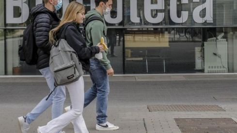 Un grup de tres estudiants a l'eixida de la biblioteca