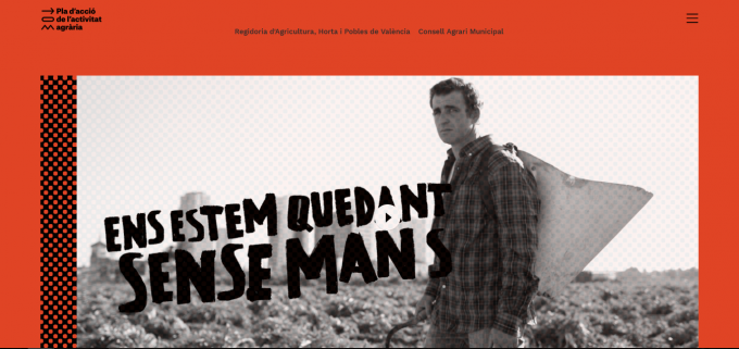 El portal de l'Ajuntament de València 'Sense mans'L'Ajuntament de València no ha volgut quedar-se arrere i també ha posat el seu granit d'arena. La seua campanya 'Ens estem quedant sense mans' pretén donar a conéixer els mecanismes del Pla d'Activitat Agrària per a revitalitzar el territori agrícola periurbà i també conscienciar sobre "la potencialitat que té l'Horta", segons la regidora d'Agricultura, Horta i Pobles, Consuelo Castillo. A través de la seua pàgina web descriuen diverses línies d'actuació: afavorir el relleu generacional, millorar la rendibilitat, promocionar l'activitat agrària responsable o la governança del sistema alimentari municipal, somie algunes d'elles.