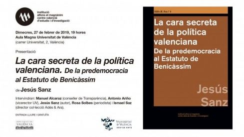 La Institució Alfons el Magnànim presentarà dimecres, 27 de febrer, a les 19.00 hores, a l'Aula Magna del Centre Cultural La Nau de la Universitat de València (carrer de la Universitat, 2), el llibre La cara secreta de la política valenciana. De la predemocracia al Estatuto de Benicàssim, de Jesús Sanz, recentment reeditat pel Magnànim dins de la col·lecció d'Història Contemporània Adés&Ara. A l'acte participaran Jesús Sanz, Manuel Alcaraz (conseller de Transparència), Antonio Ariño (vicerector de Cultura, UV), Rosa Solbes (periodista) i Ismael Saz (director col·lecció Adés&Ara i catedràtic d'Història Contemporània UV).