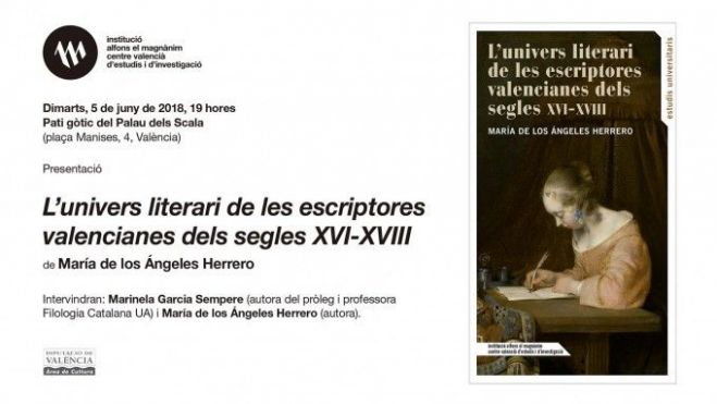 El proper dimarts 5 de juny, a les 19’00 hores, la Institució Alfons el Magnànim-Centre Valencià d’Estudis i d’Investigació, que depén de l’àrea de Cultura de la Diputació, presentarà una de les últimes novetats editorials, el llibre L’univers literari de les escriptores valencianes dels segles XVI-XVIII. L’acte, que tindrà lloc al Pati Gòtic del Palau dels Scala (Manises, 3), seu de la Diputació de València, comptarà amb la participació de l’autora, María de los Ángeles Herrero, doctora en Llengua i Literatura Catalanes per la Universitat d’Alacant, i de Marinela Garcia Semper, encarregada de prologar el llibre i professora de Filologia Catalana de la Universitat d’Alacant.