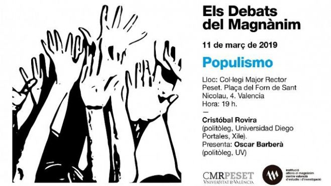 Cristóbal Rovira, politòleg de la Universidad Diego Portales de Xile, protagonitzarà el dilluns, 11 de març, una nova sessió de ‘Els Debats del Magnànim’ amb el títol Populismo. Rovira, que serà presentat per Oscar Barberà (professor de Ciència Política de la Universitat de València), és l'autor, junt amb el politòleg holandés Cas Mudde, del llibre Populisme. Una molt breu introducció, recentment publicat pel Magnànim dins de la col·lecció Debats. Es tracta de la traducció d’un llibre que es va publicar en primer lloc en la prestigiosa editorial Oxford University Press. Tenint en compte l’actualitat del tema i l’interés del text, publicat pels britànics en una col·lecció divulgativa, el Magnànim va decidir fer una versió en valencià. El debat tindrà lloc a les 19 hores, al Saló d’Actes del Col·legi Major Rector Peset. L'entrada serà lliure i gratuïta fins a completar l'aforament de la sala i els assistents podran adquirir el llibre, també a la venda en llibreries i a la web del Magnànim.
