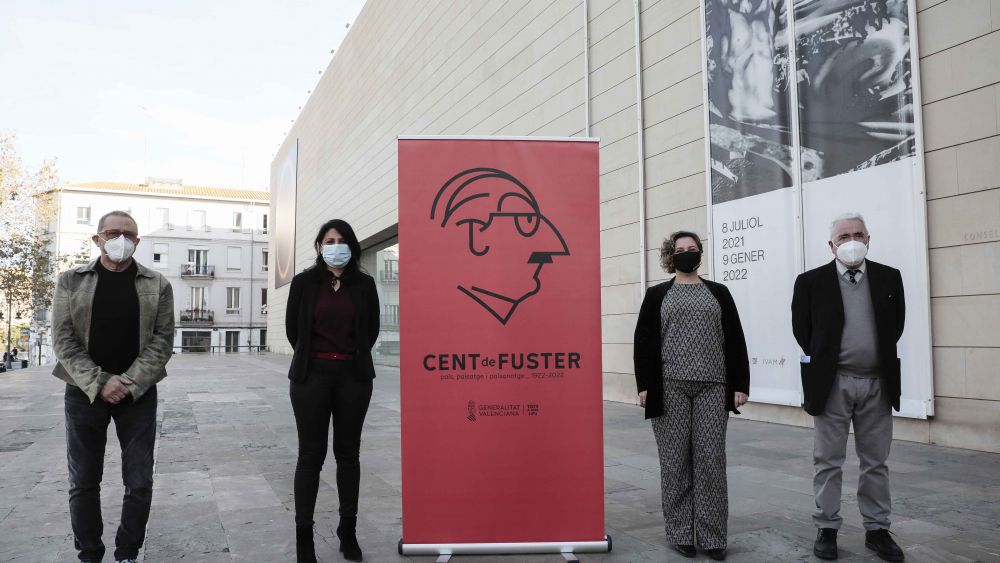 La secretària autonòmica de Cultura i Esport, Raquel Tamarit, juntament amb la directora general de Promoció Institucional, Fernanda Escribano, el dissenyador de la imatge, Dani Nebot, i el comissari de l’Any Joan Fuster, Francesc Pérez Moragón, ha presentat la imatge que acompanyarà durant l’any que ve les activitats i propostes que s’organitzen al voltant de la commemoració del centenari del naixement del pensador valencià.
