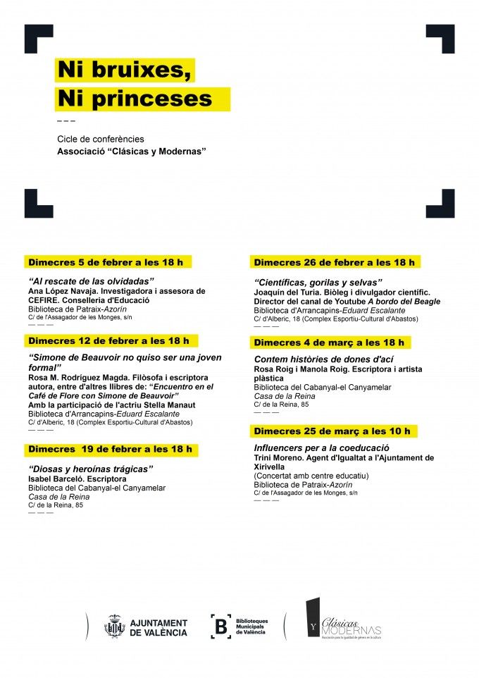 La Xarxa de Biblioteques Municipals de València acollirà tots els dimecres de febrer i dos dimecres de març el cicle de conferències “Ni bruixes, ni princeses”, emmarcat en les activitats del Dia de la Dona. Una iniciativa que ha sigut promoguda per l'Associació per a la igualtat de gènere en la cultura Clàssiques i Modernes (CyM) amb la col·laboració de la regidoria d'Acció Cultural de l'Ajuntament de València, i que forma part del programa ‘Biblioteques en Igualtat’, amb el qual es pretén “recuperar i visibilitzar el coneixement d'autoria femenina”.