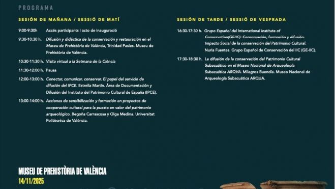 Durant la jornada tindran lloc diferents conferències amb diversos especialistes que, a partir de les seues experiències, mostraran com es pot divulgar la conservació i la restauració del patrimoni. Al costat del Museu de Prehistòria, institucions com l'Institut del Patrimoni Cultural d'Espanya (IPCE), l'Associació de Conservadors i Restauradors d'Espanya (ACRE), el Grup Espanyol de l'International Institute for Conservation of Historic and Artistic Works (GEIIC) o la Universitat Politècnica de València, s'unixen a esta iniciativa enriquidora i amb un gran valor educatiu.
