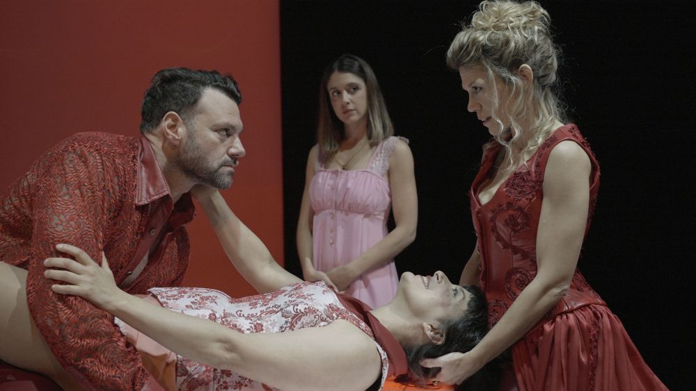 En un escenari en blanc, una taula llarguíssima, també blanca. Destaquen quatre personatges amb un vestuari en tons rojos, que barreja influències actuals i barroques. Puntilles, encaixos, velluts i corsets es combinen amb texans, làtex o cuir. Al llarg de la funció, amb total naturalitat, igual sonen composicions d’aire barroc que influències del so techno. I els protagonistes poden escriure’s cartes per a, més tard, contactar per videotrucada en relacions on es canibalitzen els uns als altres. Però, sobretot, es lliuren a l’apetit del públic en un festí escènic.