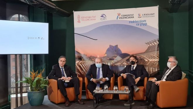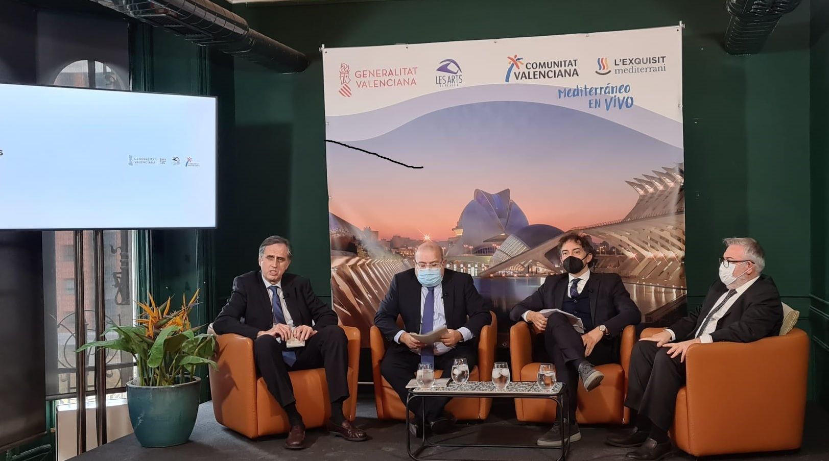 El secretari autonòmic de Turisme, Francesc Colomer, juntament amb el president del patronat dels Arts, Pablo Font de Mora, han presentat a Madrid la Comunitat Valenciana i la seua oferta cultural i gastronòmica, on a més el director artístic dels Arts, Jesús Iglesias Noriega, ha explicat totes les novetats del projecte artístic.