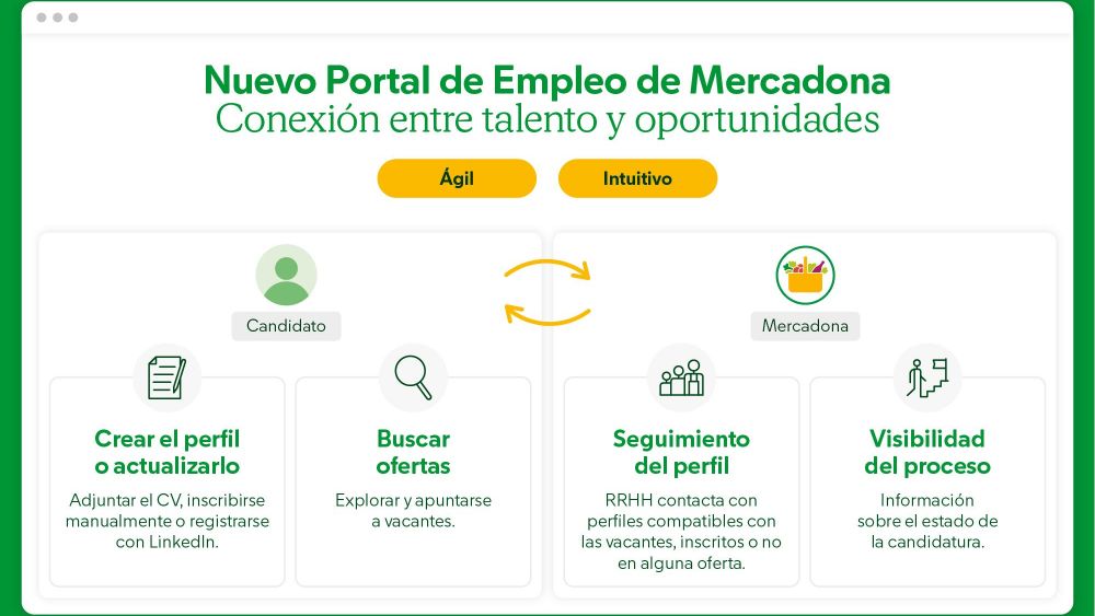 Sempre has pensat a treballar per a Mercadona? Per tant, des de hui ho tens més fàcil: Mercadona ha obert este dilluns al públic el seu nou portal d'ocupació, amb un redisseny complet en la seua imatge, una redistribució dels seus components i una nova manera de gestionar les candidatures. Amb una interfície molt més intuïtiva, la nova plataforma oferix opcions personalitzades d'ocupació i anuncia que contactarà de manera proactiva amb els candidats, en una aposta de la cadena de supermercats valenciana de gestionar de manera òptima la captació de talent. A més, tots estos canvis no venen sols: a principis de mes, Mercadona va donar a conéixer les dades de la seua inversió històrica en formació i desenvolupament professional, reafirmant el seu compromís amb les persones com a eix central del seu model de Recursos Humans. Vols saber tot el que conté el nou portal d'ocupació de Mercadona? T'ho contem tot: