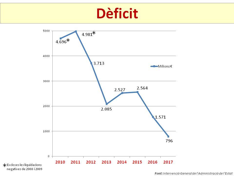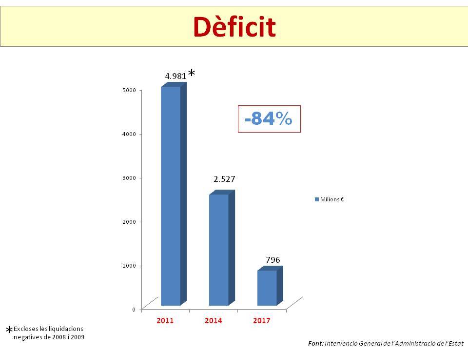 En 2014, últim any complet de gestió anterior Consell, la bretxa respecte a l'objectiu de dèficit va ser d'1,60 punts; és a dir, 12 vegades major que la registrada en 2017 (0,13). Els números rojos han disminuït dràsticament en comparació de 2014 i, sobretot, en relació a 2011, quan va aconseguir cotes molt elevades. En concret, el dèficit s'ha minorat un 84% respecte a 2011, quan el desfasament entre ingressos i despeses va sumar 4.981 milions (-4,95% de PIB), sense tindre en compte la liquidació negativa de 2011.
