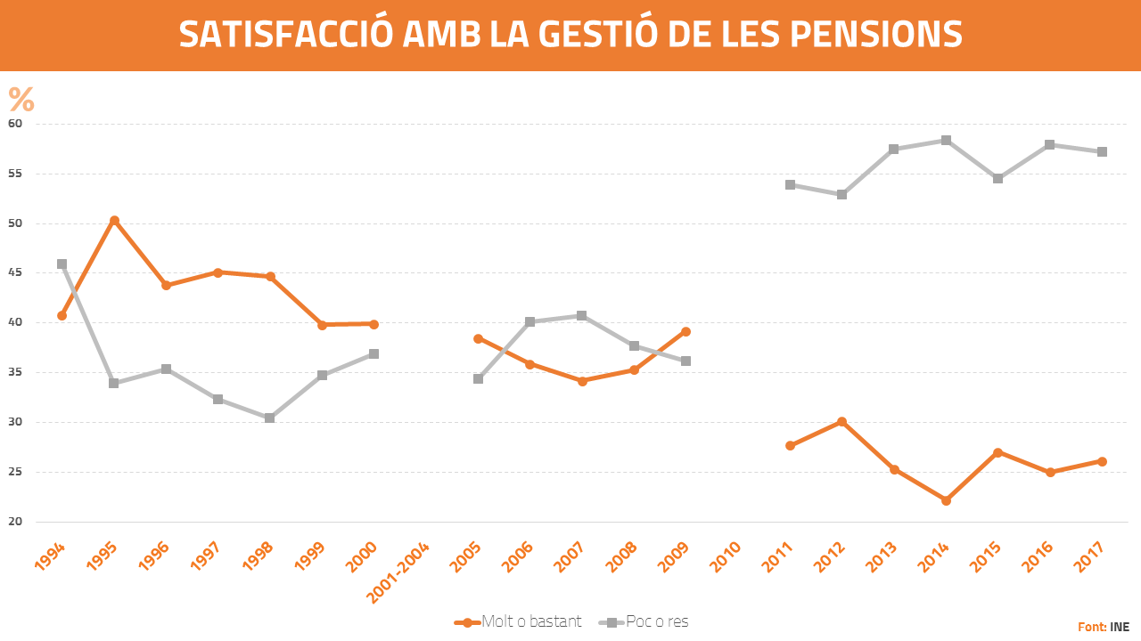 I és que la gestió del sistema de prestació per jubilació mai ha sigut dels millors valorats a Espanya. De tots els estudis, solament en 1995 més del 50% dels enquestats van afirmar estar bastant o molt satisfets amb ell. Però va ser a partir de l'esclat de la crisi econòmica quan el descontentament va començar a fer-se de notar. En 2014, quasi 6 de cada 10 estaven poc o gens satisfets amb la gestió de les pensions. En 2017 es va relaxar, però així i tot el 57% seguien pensant igual.