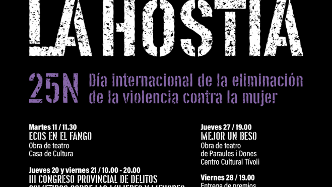 Este año, bajo el lema El amor no es la hostia, las actividades comienzan el martes 11 de noviembre con la obra de teatro Ecos en el fango, pensada para los IES del municipio. La obra explora la violencia machista en el ámbito familiar, donde las experiencias de malos tratos y abusos hacia la mujer desbordan la noción misma de “violencia de género”, ya que afectan e influyen en los hijos e hijas. La representación pone el foco en las vivencias de las niñas y niños que conviven con las agresiones y que usan la imaginación y el juego como refugio y resistencia.