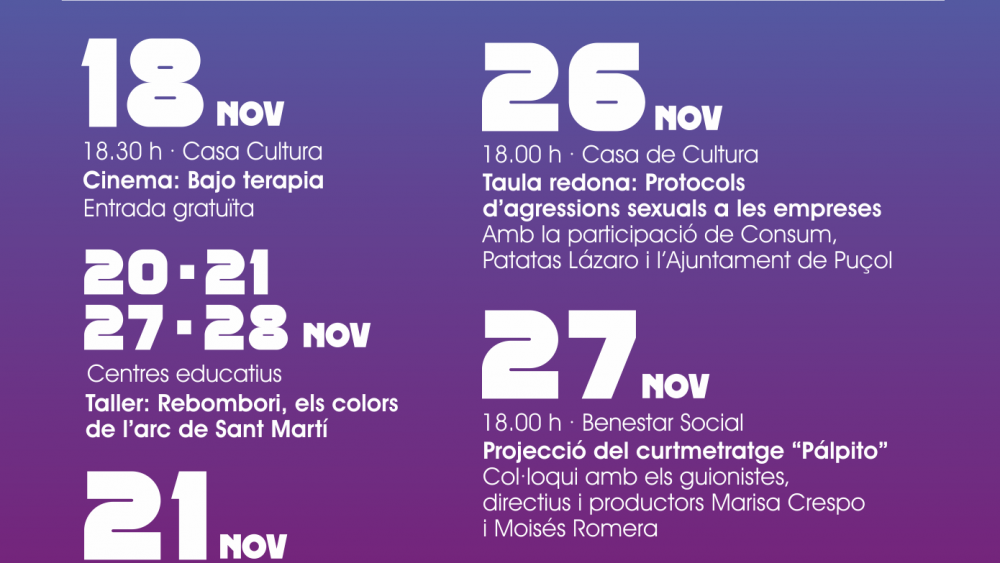 Cada año, durante el mes de noviembre el Ayuntamiento de Puçol organiza una amplia programación de actividades en torno al 25-N, Día Internacional de la Eliminación de la Violencia Contra la Mujer