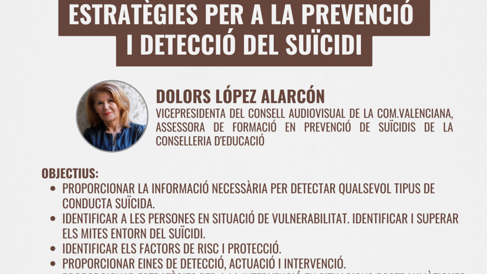 Esta segunda edición está orientada a "Estrategias para la prevención y detección del suicidio" impartida por Dolors López Alarcón, vicepresidenta del Consell Audiovisual de la Comunitat Valenciana y asesora de formación en prevención de suicidios de la Conselleria d’Educació.