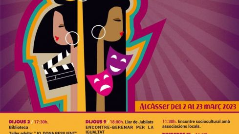 Las Jornadas de Igualdad de Alcàsser terminarán con la proyección de los largometrajes seleccionados del palmarés del festival internacional ‘Dona i Cinema’ (21 de marzo, a las 18:30 h, en el Centre Cultural); y el taller de autoestima impartido por Laia Gimeno, el 23 de marzo en la Sala de Conferencias del Centre Cultural (18:00 h).
