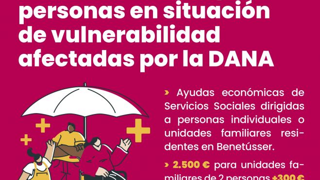 El Ayuntamiento de Benetússer, a través de su concejalía de Servicios Sociales, ha abierto el plazo de solicitud de ayudas económicas directas destinadas a personas en situación de vulnerabilidad afectadas por la DANA con unos fondos que ascienden a un total de 470.000 euros concedidos al municipio por el Ministerio de Derechos Sociales. Estas ayudas, que pueden solicitarse presencial o telemáticamente hasta el 1 de septiembre, tienen como beneficiarias a las personas físicas mayores de edad y residentes en Benetússer que no dispongan de los recursos o ingresos suficientes para afrontar la situación derivada de la emergencia y que así puedan justificarlo. “La puesta en marcha de este escudo social tiene como fin evitar que se agrave la situación de aquellas familias de Benetússer que no pueden hacer frente a la carga económica que están soportando en este momento, permitiéndoles afrontar mejor su día a día y recuperarse tras la catástrofe”, informa la alcaldesa de la población, Eva Sanz Portero.