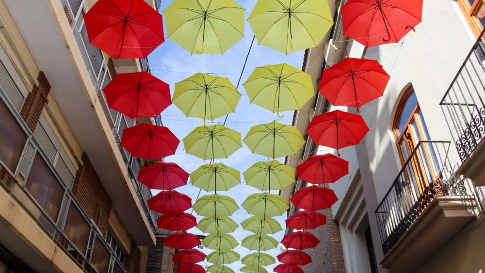 De este modo, en la calle Sagra la ciudadanía puede apreciar cómo los paraguas de color rojo y amarillo conforman la bandera nacional que tiene 50 metros de longitud. Mientras tanto, en la calle San Cristóbal se han instalado paraguas rojos, amarillos y también de color azul que forman una Reial Senyera, el emblema de la Comunitat Valenciana, de 70 metros de largo.