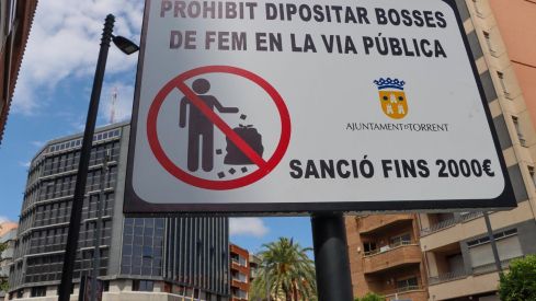 Cartel sobre la prohibición de tirar bolsas de basura a la vía pública en Torrent