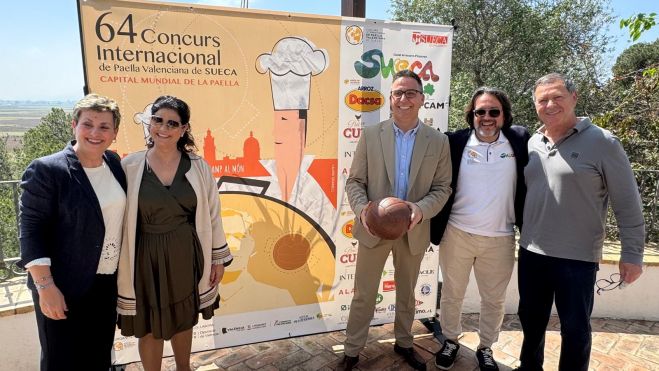 El alcalde de Sueca, Julián Sáez; la concejal de Turismo y responsable del certamen, Teresa Ribes; el director del Concurs, Tony Landete; el coordinador gastronómico, Adolfo Cuquerella; y el presidente del Gremio de Hostalería de Sueca y Playas, Salvador Ortega; han intervenido en el acto, en el que se ha aprovechado también para presentar el cartel anunciador de la próxima edición cuyo protagonismo recae en dos de los mejores embajadores de la ciudad de Sueca: la paella valenciana y el querido y recordado futbolista Antonio Puchades. “El acontecimiento más internacional que tenemos no podía quedar al margen de la celebración del Any Puchades. Por ello, este año el certamen estará dedicado a Tonico a través del cartel de esta edición inspirado en su figura. Quiero agradecer a la diseñadora gráfica de Sueca, Laura Granell, su genial aportación al certamen”, ha señalado el alcalde de Sueca con delegación de Deportes, Julián Sáez, quien ha explicado también que Puchades fue un jugador de fútbol que, desde Sueca, desde un campo, en su caso de fútbol, se proyectó al mundo disputando incluso un Mundial, “lo mismo ocurre con la paella, nuestro plato más internacional que se cocina con nuestro arroz, el que, como Puchades, sale de aquí, del pueblo, del campo. Ese paralelismo entre lo que fue Puchades y lo que es la paella ha inspirado el lema de esta edición del Concurs: ‘Del camp al món’”.