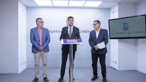 El alcalde de Gandia, José Manuel Prieto, acompañado del vicealcalde, Josep Alandete, y del concejal de Economía y Hacienda, Salvador Gregori (Àlex Oltra)