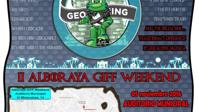 El municipio de Alboraya, declarado en 2015 como ciudad abierta al Geocaching, se enorgullece de poder invitar a toda la comunidad en general a disfrutar de un evento único, el II Alboraya GIFF Weekend, un festival internacional de cortos de cine, con temática sobre Geocaching, que se realizará mañana sábado 5 de noviembre en el Auditorio Municipal de Alboraya.