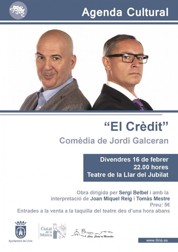 El programa de actuaciones arranca este próximo viernes, 16 de febrero, con la obra de teatro “El crèdit”, una divertida comedia para un público adulto, escrita por Jordi Galceran, dirigida por Sergi Belbel y con la interpretación de Joan Miquel Reig y Tomàs Mestre. La representación tendrá lugar en el Teatro del Hogar del Jubilado a las 22.00 horas.