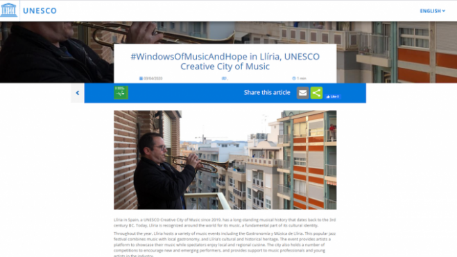 El artículo comienza poniendo en valor la histórica tradición musical edetana: "Llíria, en España, Ciudad Creativa de la UNESCO desde 2019, tiene una larga historia musical que data del siglo III a.C. Hoy Llíria es reconocida en todo el mundo por su música, una parte fundamental de su identidad cultural". Prosigue la UNESCO contextualizando el momento en que se lanzó la iniciativa: "En respuesta al confinamiento de los ciudadanos españoles para prevenir la difusión del COVID-19, a través de su campaña en redes sociales #VentanasDeMusicaYEsperanza, se lanzó un mensaje de esperanza junto a la importancia de permanecer en los hogares. Llíria usa la música para unir a la gente en tiempos problemáticos, ayudando a aliviar las dificultades a las que se enfrentan por las medidas de distanciamiento social". Concluye el artículo destacando la atención mediática que suscitó el evento: "La campaña ha acumulado atención de medios locales y nacionales, que la emitieron en directo desde Llíria a través de sus medios digitales y tradicionales. Fue especialmente popular entre la juventud: cientos de vídeos de jóvenes músicos interpretando la ‘Novena Sinfonía’ pueden ser encontrados en las redes sociales más populares".