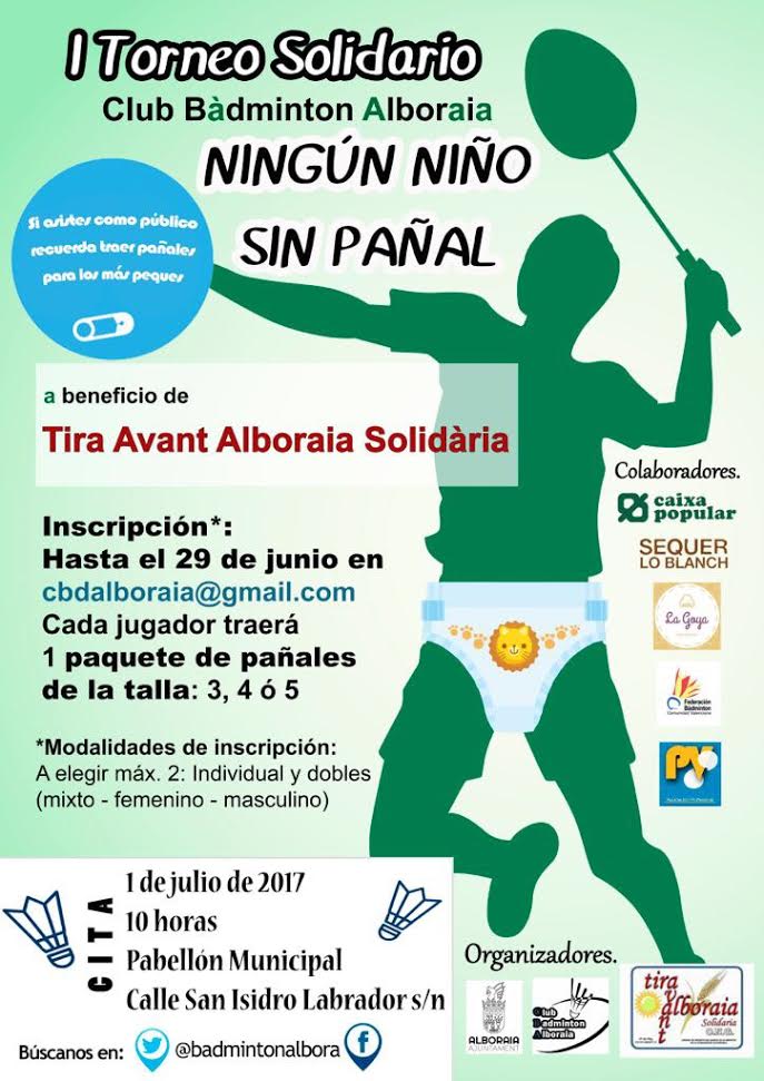 El I Torneo Solidario "Ningún niño sin pañal" es una iniciativa solidaria y deportiva organizada por el Club Bàdminton Alboraia, el Ayuntamiento de Alboraya y la ONG Tira Avant Alboraia Solidària. Cuenta con la colaboración de Caixa Popular, Sequer Lo Blanch, La Goya més que fils, Federación de Bádminton de la Comunitat Valenciana, la Asociación Profesional de Periodistas Valencianos, Imprenta Baquero, Palmaret Esports, Cafetería Ciutat de l'Esport, Titi's Coffee, Talleres Autogrup, Peluquería Maen y Talleres Herrera.
