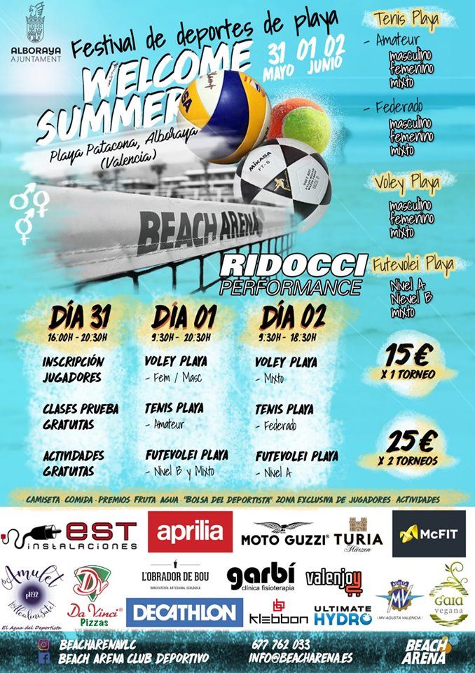 Además, el evento deportivo acercará la música a la playa con una amplia oferta de actividades dirigidas para todos los públicos. Desde zumba, GAP, Body fight, bailes latinos, Allobo Dance, Cubbá y Kangoo Jumps, protagonizarán un fin de semana al ritmo de la música.La Patacona se prepara para la segunda edición del 'Welcome Summer' organizado por Beach Arena Club Deportivo y con la colaboración del Ayuntamiento de Alboraya. Comienza la temporada estival con el deporte veraniego como protagonista.