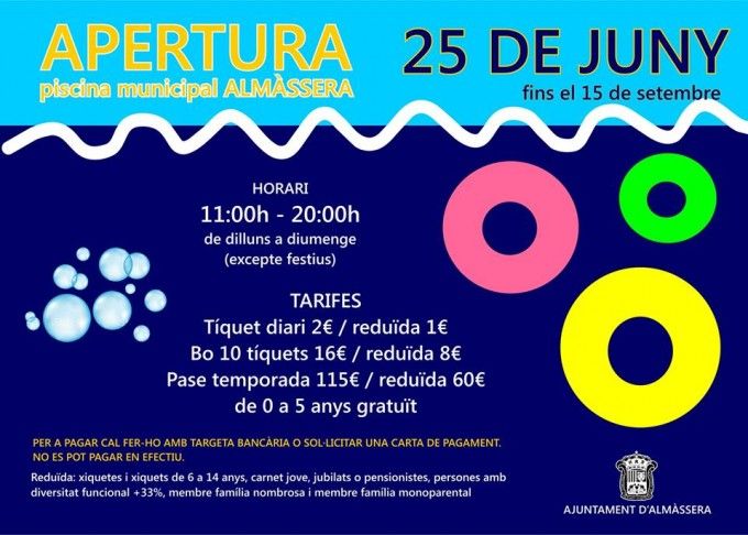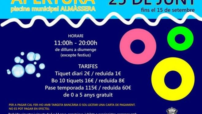 Así, Almàssera disfrutará de una amplia temporada de piscina durante este verano 2019 y con diferentes tarifas para todos los bolsillos y necesidades de los vecinos y vecinas del municipio de l’Horta Nord.